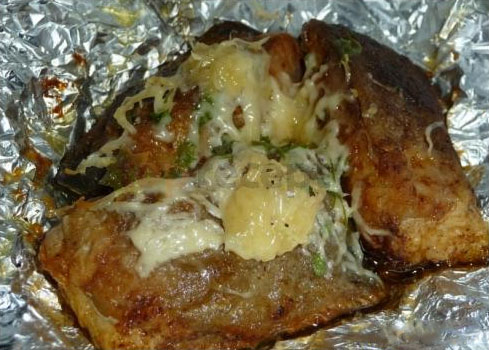 povrch kapra poklademe petrželovým máslem, alobal dobře uzavřeme a pečeme na plechu ve