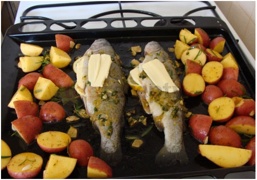 Příprava:Bylinky si natrháme na malé kousky, česnek rozmačkáme a dáme do hmoždíře, přidáme citronový olej a citronovou kůru umícháme pastu.Pstruha opláchneme ve studené vodě, osušíme papírovou utěrkou z každé strany, pstruha třikrát nařízneme, mírně osolíme okořeníme kořením na rybu, do zářezů dáme pastu a dáme na plech do každého pstruha dáme plátek citronu a másla plátek másla dáme i na pstruha, pokapeme citronovou šťávou. Brambory pořádně umyjeme pod tekoucí vodou, nakrájíme na 1/4 dáme do mísy, přidáme otrhaný rozmarýn rozmačkaný česnek olej koření na americké brambory a mírně osolíme pořádně promícháme a dáme na plech k pstruhům. Troubu rozehřejeme na 220° pečeme 20 minut, ke konci pečení asi na 5 min. zapneme gril a dopečeme (doba pečení a grilování je orientační, záleží na troubě). Přejeme dobrou chuť.